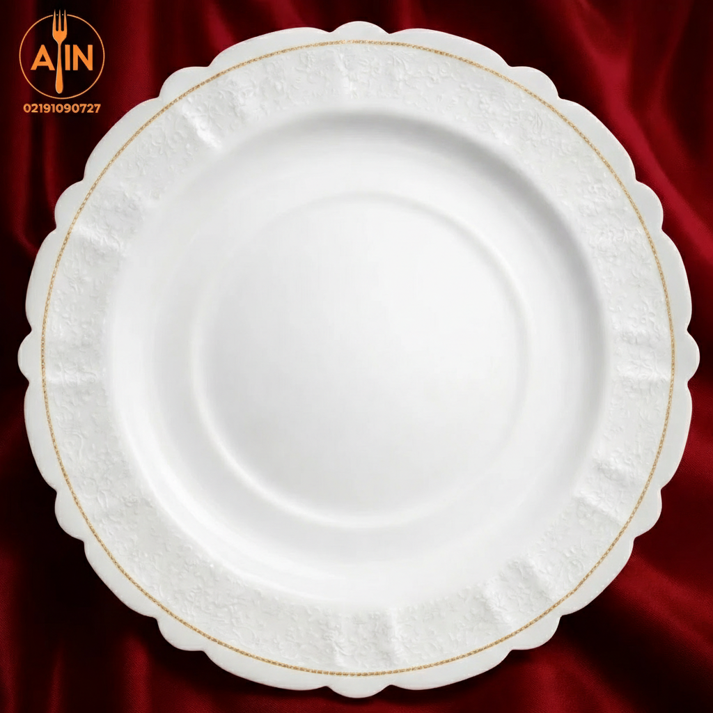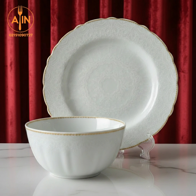 با لبههای طلایی، جلوهای مجلل و لوکس به ظروف میدهد و برای پذیرایی رسمی بسیار مناسب است.