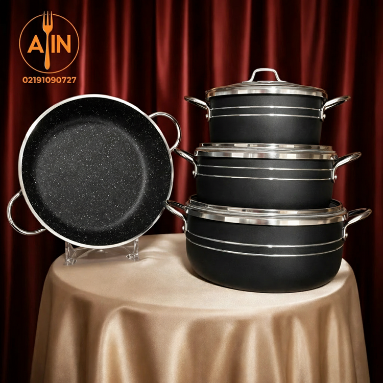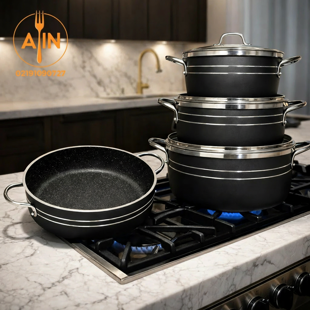 هر سرویس شامل قابلمه، تابه، و دربهای مقاوم در سایزهای متنوع است تا پاسخگوی همهی سلیقهها و نیازها باشد.