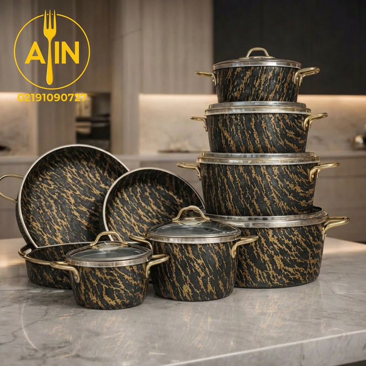 سرویس قابلمه ۱۶ پارچه اپیروس با طراحی مدرن و کیفیت ساخت بالا، گزینهای مناسب برای آشپزی روزمره و استفاده طولانیمدت در آشپزخانه است. بدنه این سرویس با طرح خاص ماربل مشکی طلایی جلوهای بسیار شیک و متفاوت ایجاد کرده و در کنار لبههای استیل براق و دستههای استیل طلایی، ظاهری لوکس و چشمگیر به قابلمهها داده است.