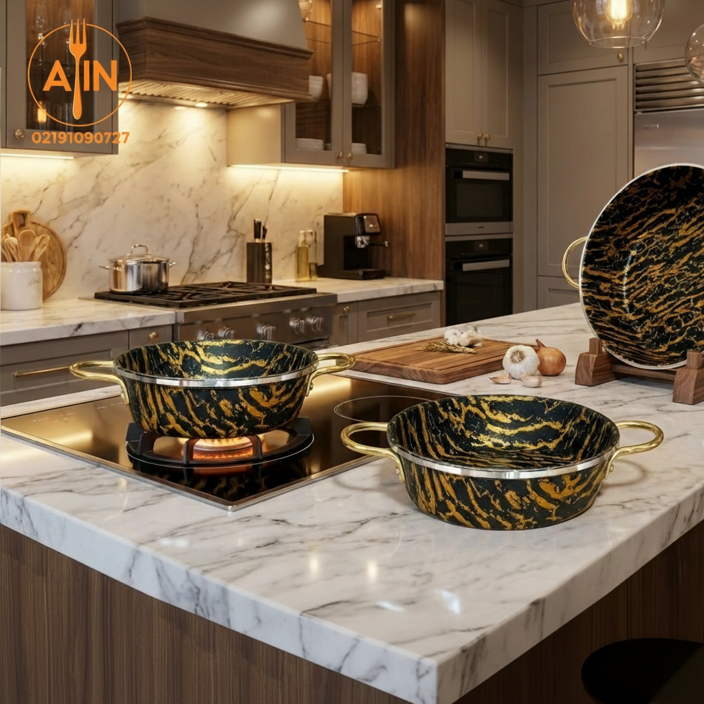 سرویس تابه اپیروس با طراحی خاص و چشمنواز، ترکیبی از زیبایی مدرن و کیفیت بالای تولید ایرانی را ارائه میدهد. طرح خاص ماربل مشکی طلایی در بدنه داخلی تابهها جلوهای لوکس و متفاوت ایجاد کرده و در کنار لبههای استیل براق و دستههای طلایی، ظاهر این سرویس را بسیار شیک و خاص کرده است.