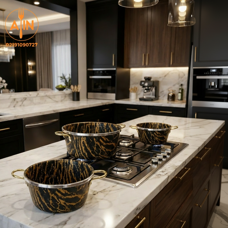 سرویس قابلمه اپیروس با طراحی خاص و چشمنواز، ترکیبی از زیبایی مدرن و کیفیت بالای تولید ایرانی را ارائه میدهد. طرح خاص پلنگی مشکی و طلایی در بدنه داخلی قابلمهها جلوهای لوکس و متفاوت ایجاد کرده و در کنار لبههای استیل براق و دستههای طلایی، ظاهر این سرویس را بسیار شیک و خاص کرده است.